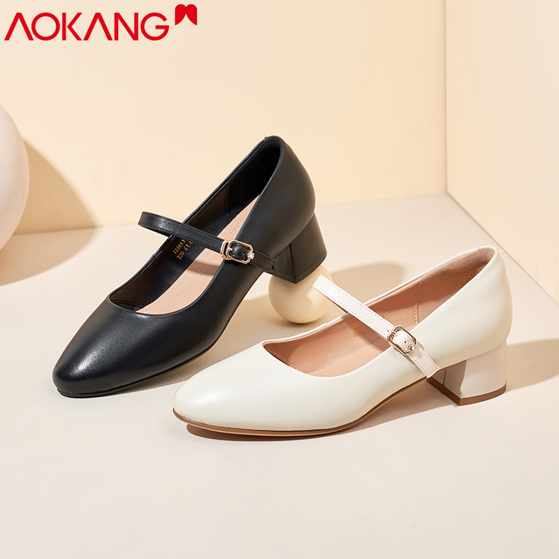 奥康女鞋春季新款百搭浅口工作皮鞋一字扣玛丽珍鞋舒适粗跟单鞋