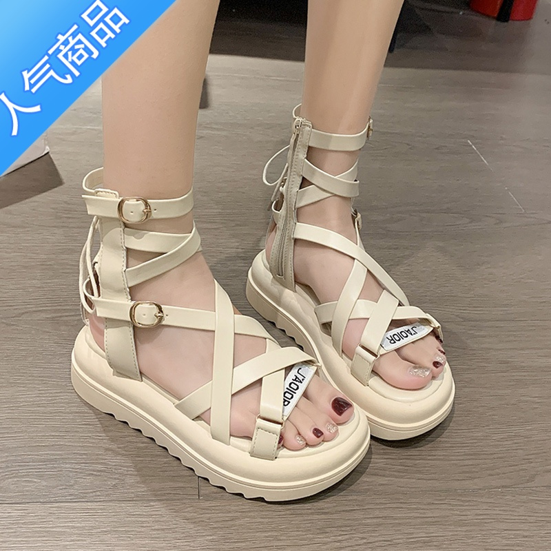 SUNTEK罗马凉鞋女夏季厚底学生百搭小众法式交叉绑带仙女风高帮镂空凉靴