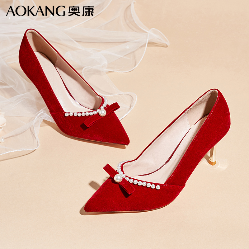 奥康女鞋红色结婚鞋女秀禾服婚纱两穿中式新娘鞋高跟鞋